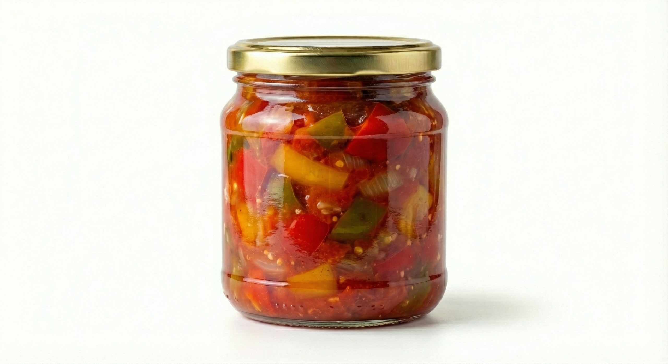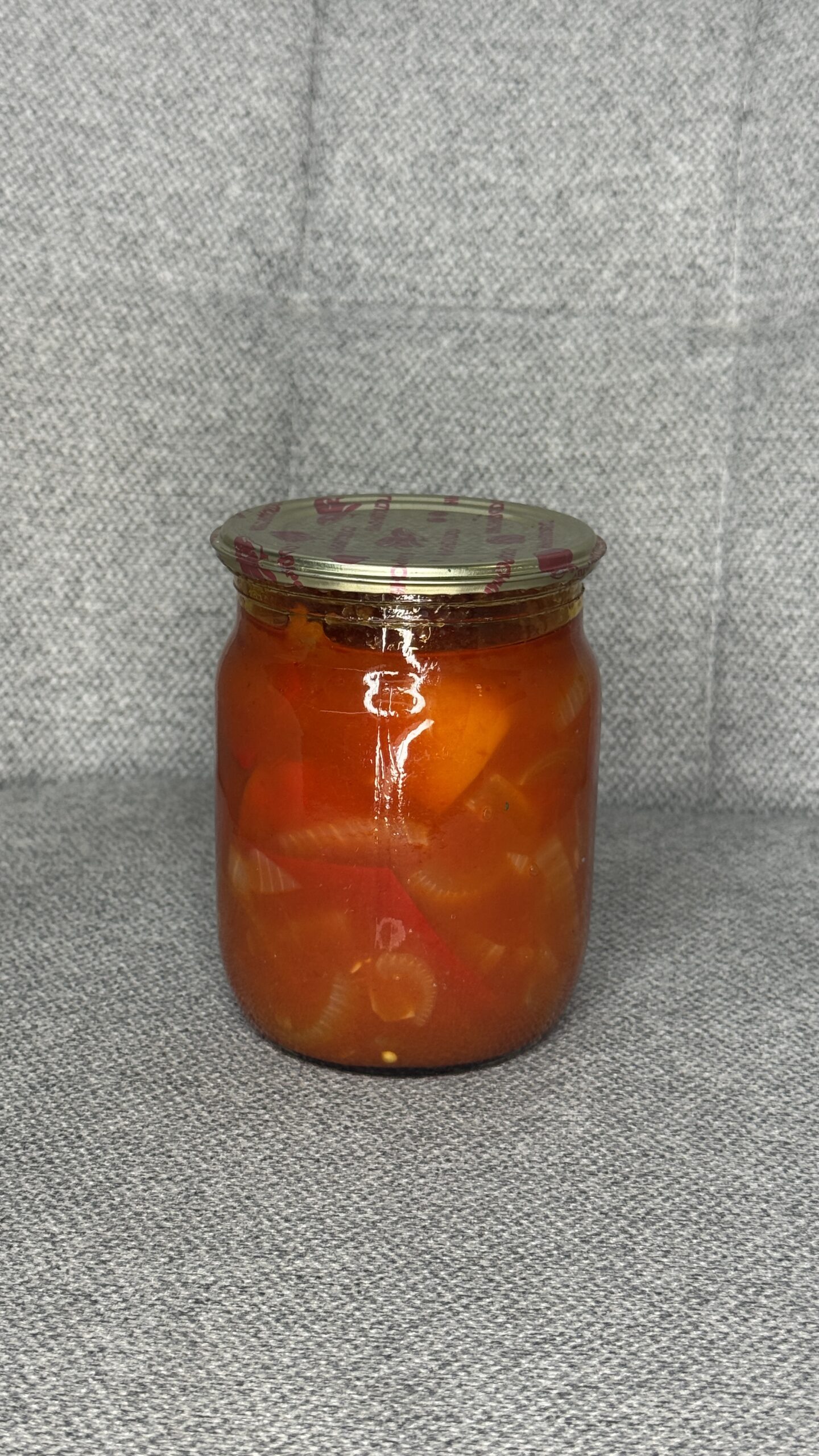 Класичне домашнє лечо з м’ясистого болгарського перцю та стиглих томатів. Овочі власного вирощування, нарізані смужками й тушковані в густому томатному соусі до м’якої, але не розвареної консистенції. Без штучних консервантів і барвників.