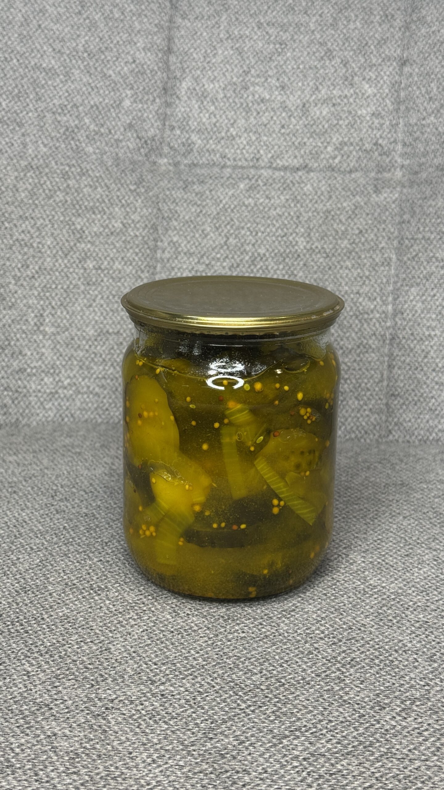 У банці — лише дрібні порізані огірочки (пікулі) в прямому маринаді. Щільні, хрусткі, з виразним смаком та легкою кислинкою. Овочі вирощені власноруч і замариновані невеликими партіями, без штучних консервантів та барвників.